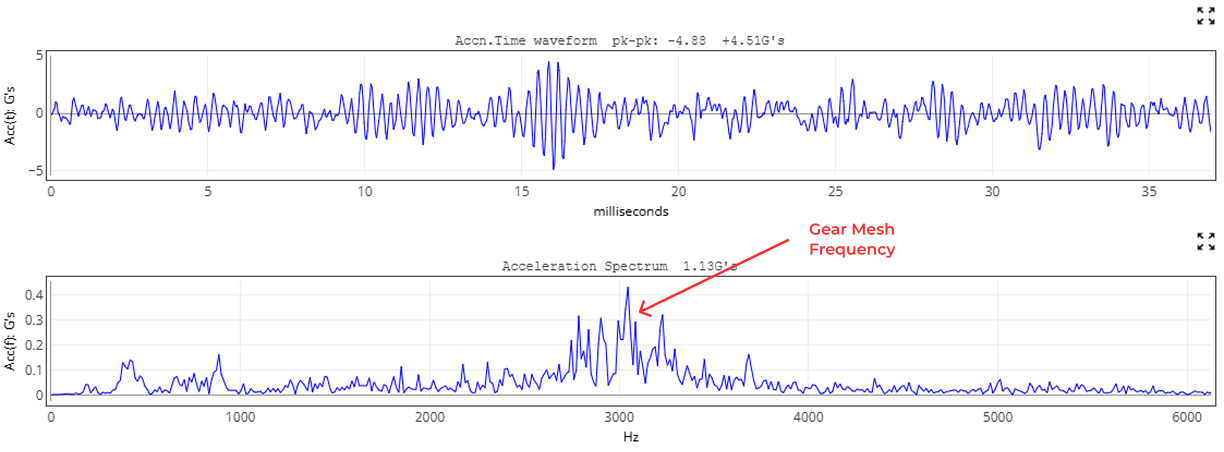 Figure 4: Acceleration waveform and spectrum confirming gear mesh activity near 3 kHz