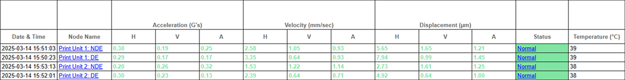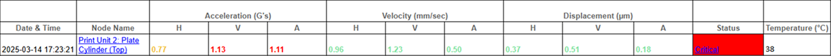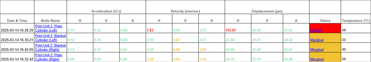 The same four nodes were measured in Print Unit 2. Two of them — Plate Cylinder – Left and Blanket Cylinder – Right — exhibited elevated displacement and velocity RMS. ARGUS’s built-in status logic flagged these points as marginal to critical.