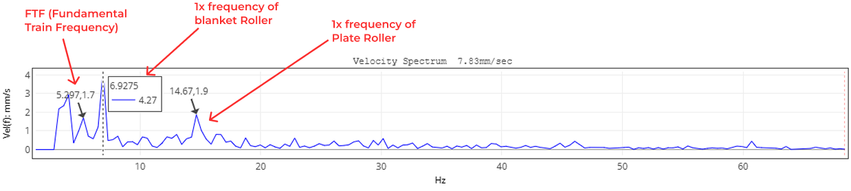 Additional peaks at 6.92 Hz and 14.67 Hz corresponded to the 1× rotational speeds of the blanket and plate rollers, respectively, and are considered normal machine components rather than fault indicators.