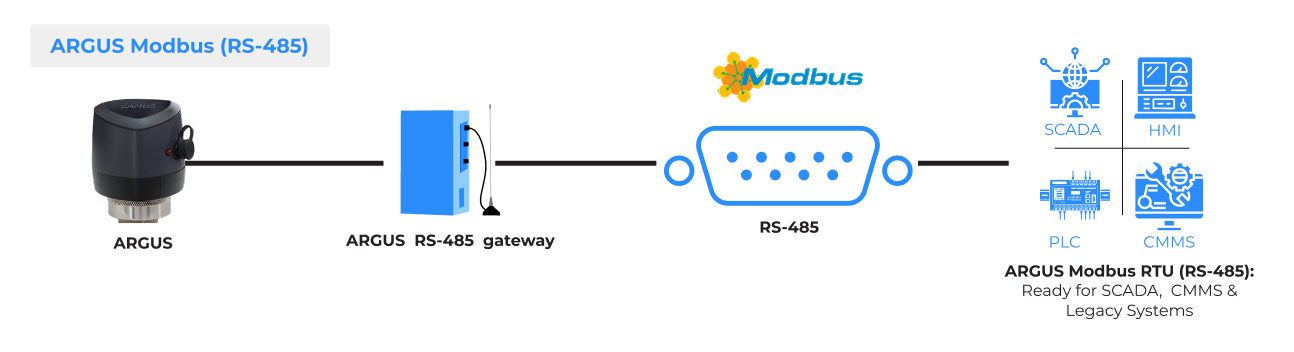 | ARGUS Modbus (RS-485) | Medium | Yes (RS-485 Gateway) | Serial Modbus RTU (RS-485) | Legacy automation systems based on RS-485 communication | When existing serial infrastructure must be preserved and integrated | Serial bus integration in legacy systems |