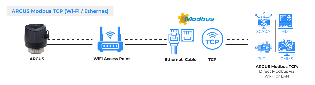 | ARGUS Modbus TCP (Wi-Fi / Ethernet) | Medium | No | Modbus TCP/IP over Wi-Fi or LAN | Modern SCADA/HMI/DCS/PLC/CMMS environments with Ethernet networks | When vibration data must be visualized within existing SCADA/PLC/HMI/CMMS dashboards | Native SCADA/PLC/HMI/CMMS connectivity over Ethernet |